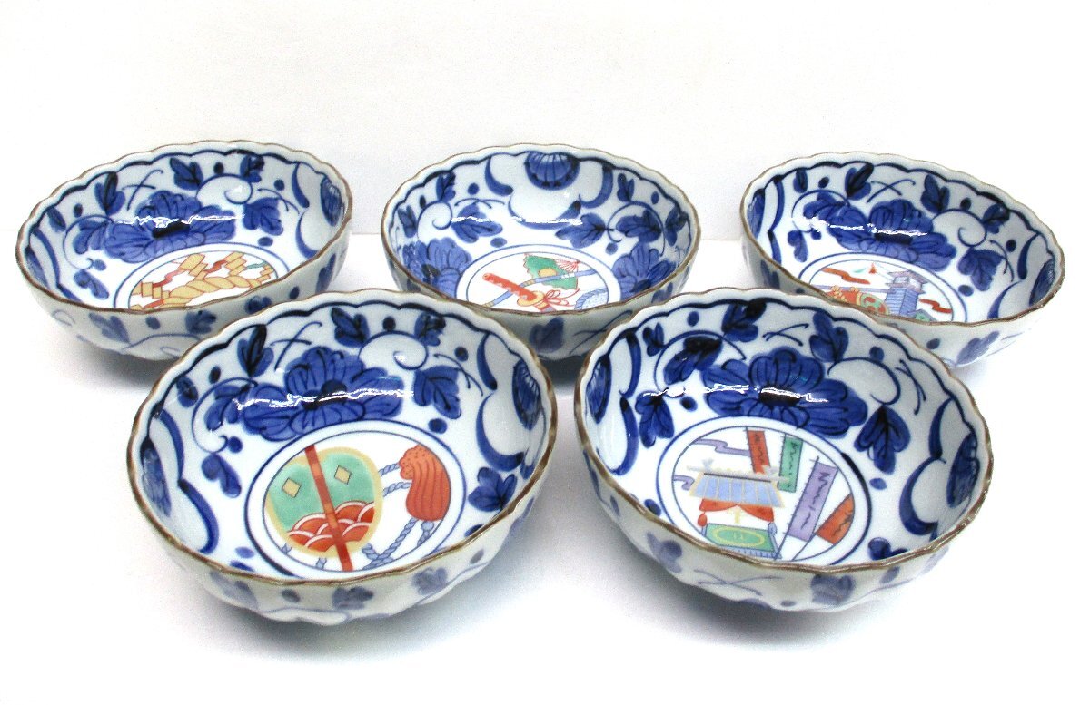 > 深皿 中鉢 三峰 染付金彩 5枚 三峰窯 絵柄5種類 直径13.8x高さ5cm 中古美品 100951★