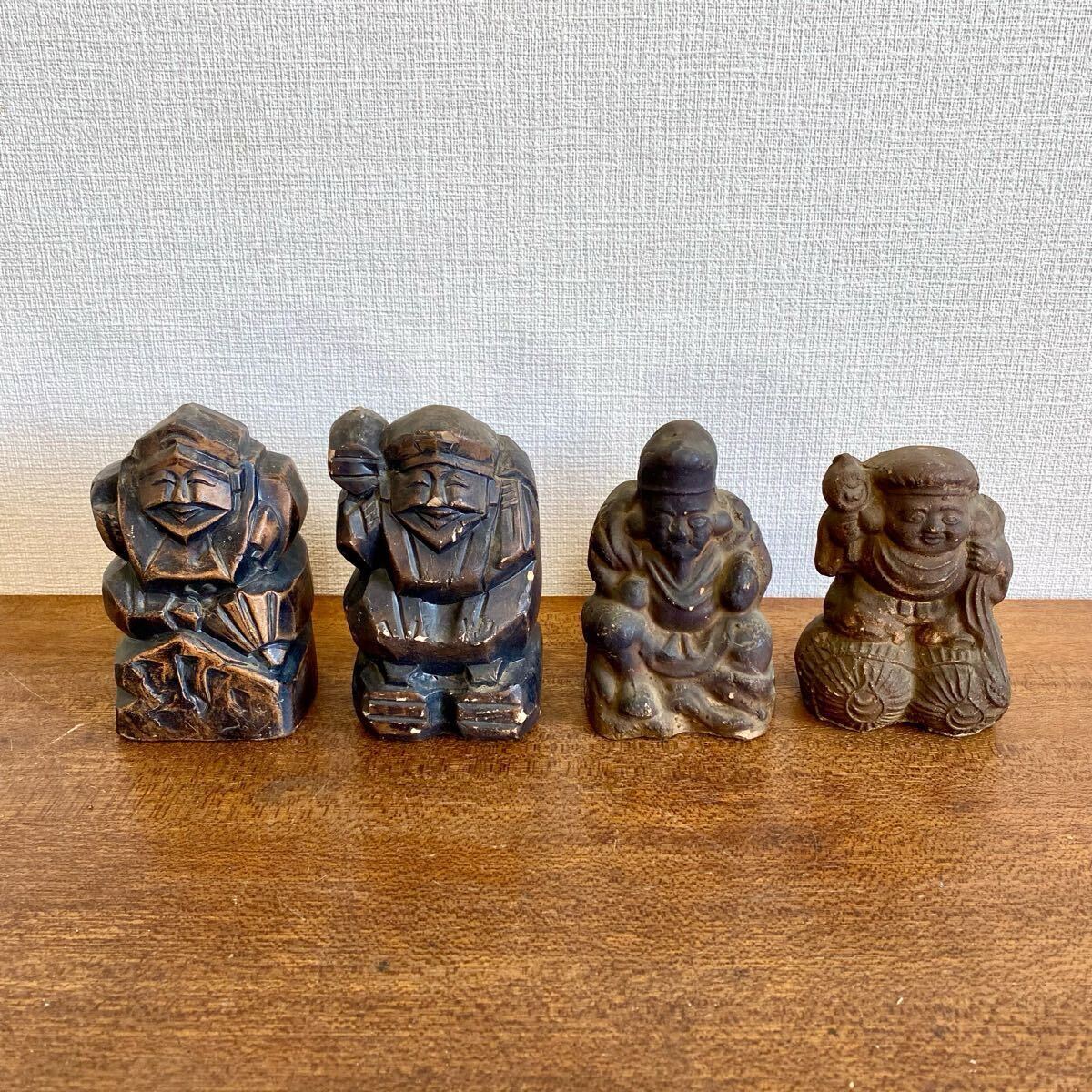 > 古い置物 恵比寿 大黒天 4点セット / 縁起物 七福神 陶器 土人形 工芸美術 伝統工芸 当時物