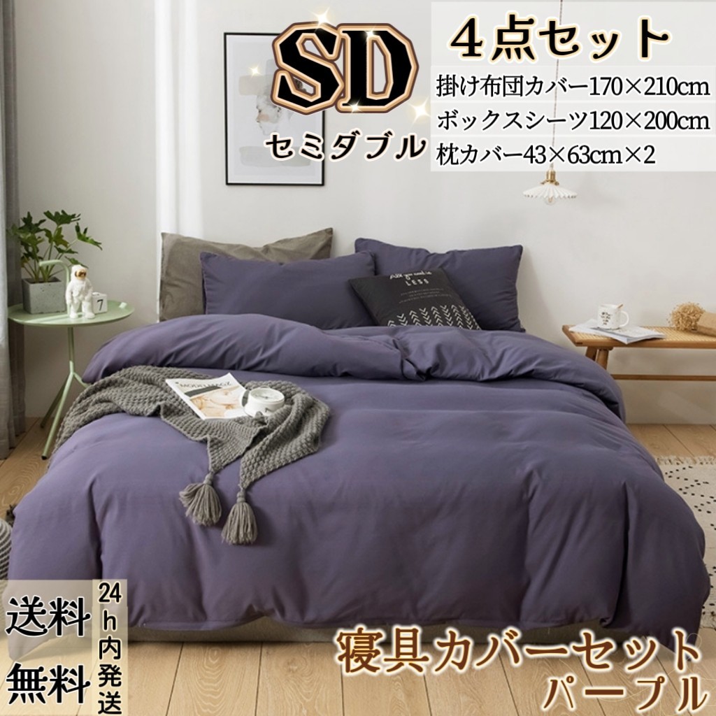 - 布団カバー セミダブル4点セット 寝具カバーセット 掛け布団カバー ボックスシーツ 枕カバー 洋式・和式兼用 冬夏兼用 パープル