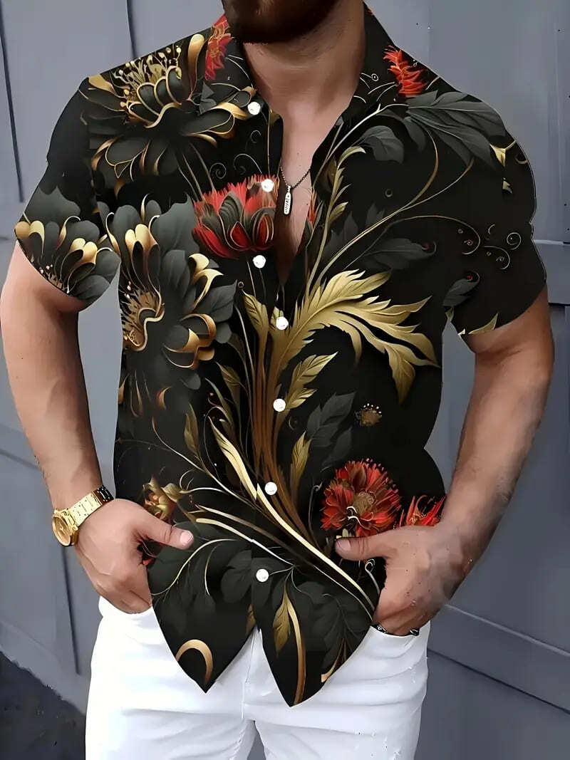 - バロック柄 花柄プリント 半袖シャツ アロハシャツ 314 黒 ヤクザ ヤンキー オラオラ系 ストリート ホスト 服 メンズ ファッション
