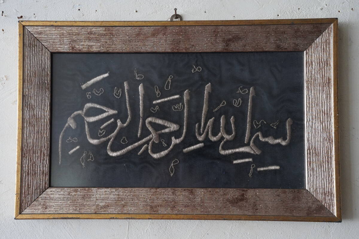 - トルコ イスラム アラビア文字 カリグラフィー イスラーム文字 モスク アンティーク 木製フレーム オブジェ 刺繍 手縫い インテリア