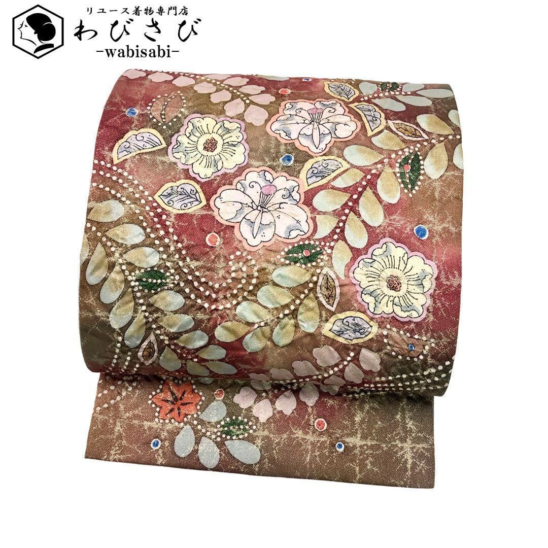 > 袋帯 作家物 格子に美しい辻が花 西陣織 証紙付 金糸 O-2674 着物 きもの kimono 和服 和装 中古 リサイクル着物 【送料無料】