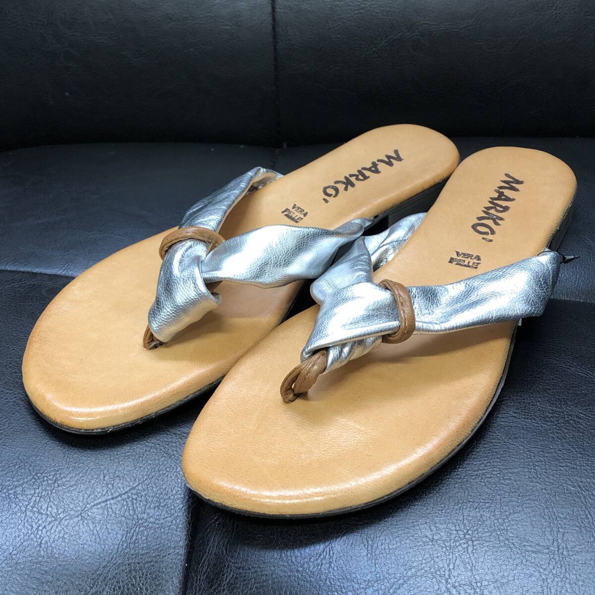 - WQ584●MARKO:レザートングサンダル ●37● シルバー フラットサンダル マルコ