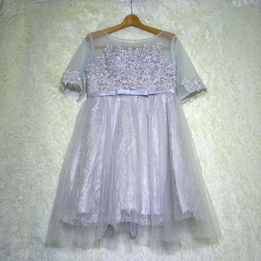 - 訳あり パーティドレス ワンピース【S】 レース刺繍 ライトグレー