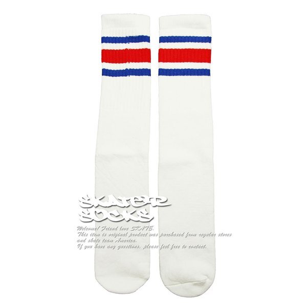 > SkaterSocks (スケーターソックス) ロングソックス 靴下 Knee high White tube socks with Royal Blue-Red stripes style 3