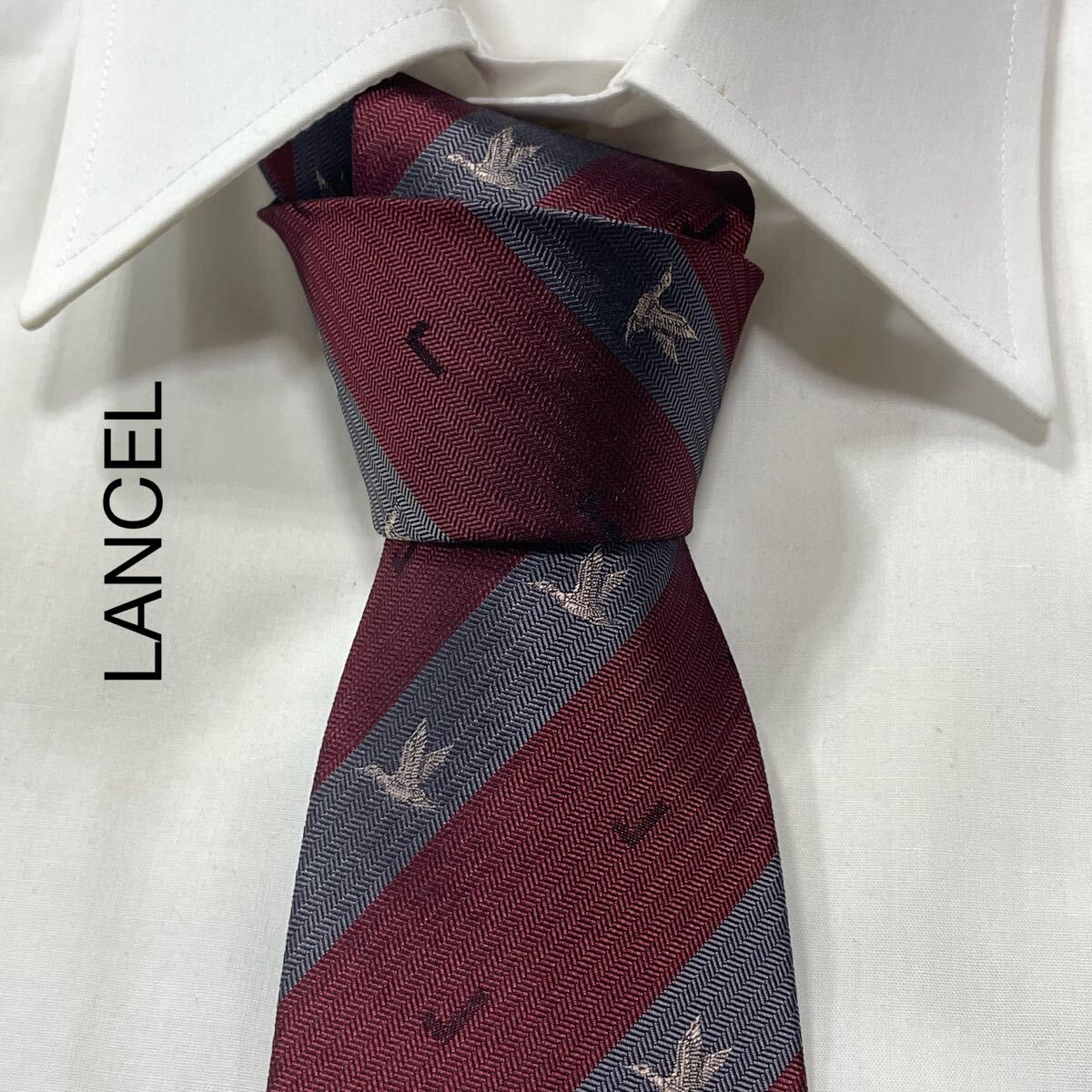 - LANCEL ランセル ロゴ カモ ジャガード レジメンタル ストライプ シルク ネクタイ 日本製 ワイン グレー TG2693