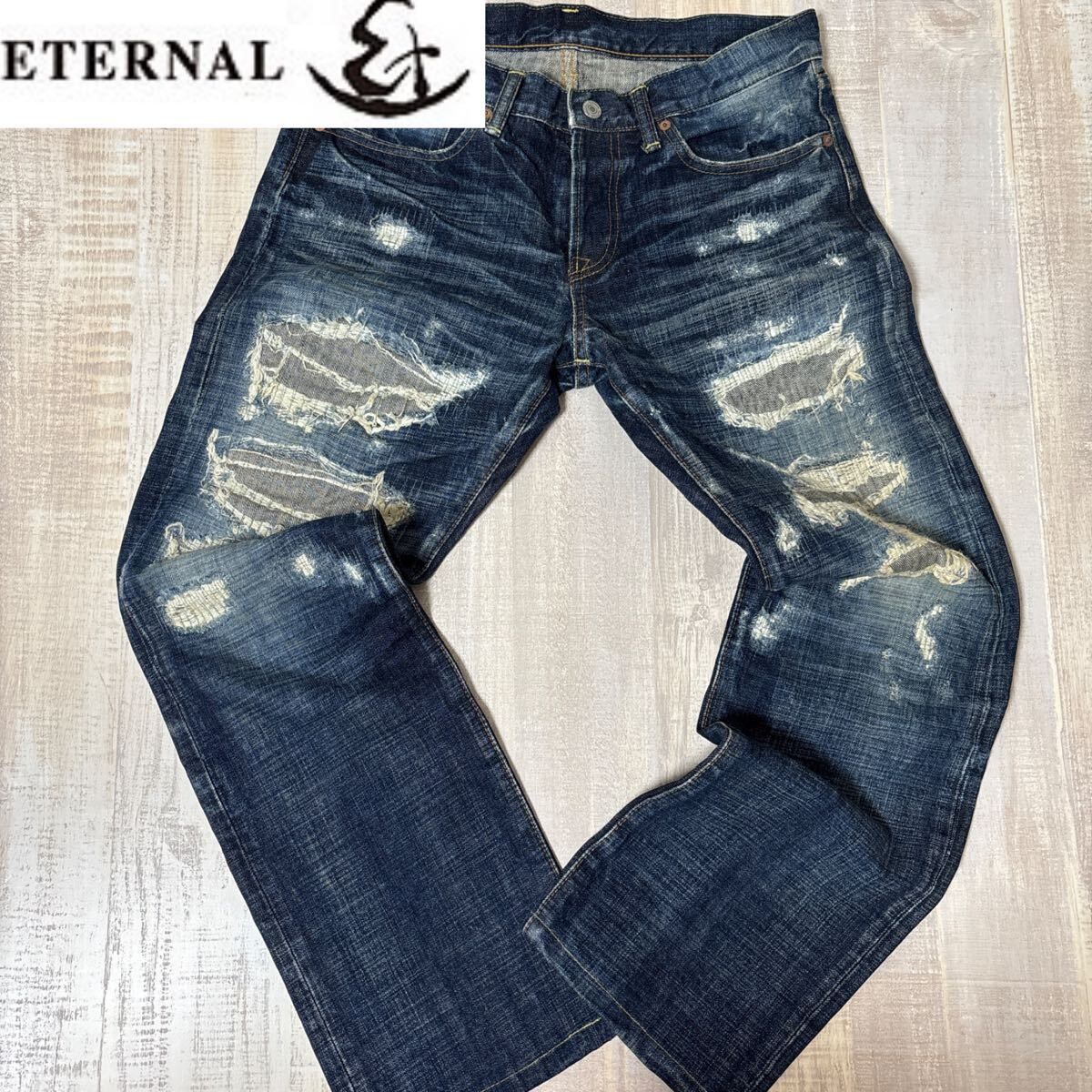 > 【日本製 迫力満点】ETERNAL 53571 クラッシュ デニム パンツ エターナル リペア加工 ダメージ size32 備中倉敷工房 ボタンフライ ジーンズ