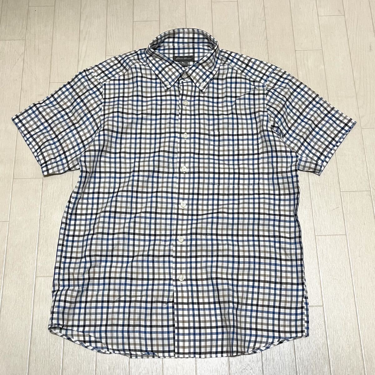 - 和803★ Eddie Bauer エディーバウアー 半袖 ボタンシャツ チェック 胸ポケット S ホワイト ブルー メンズ ボタンダウン リネン混