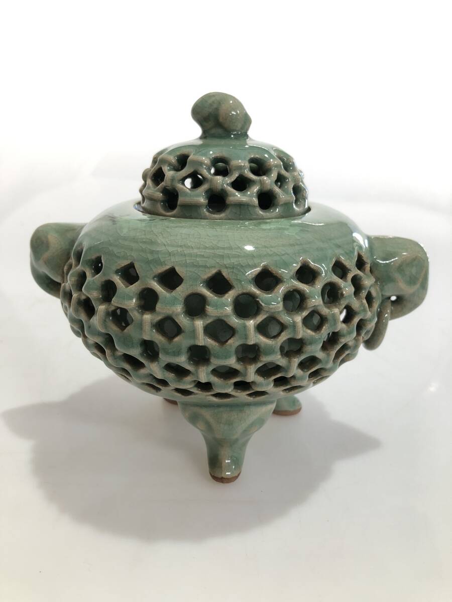 - B4413 高麗青磁 海日 香炉 彫透 三足 香道具 茶道具