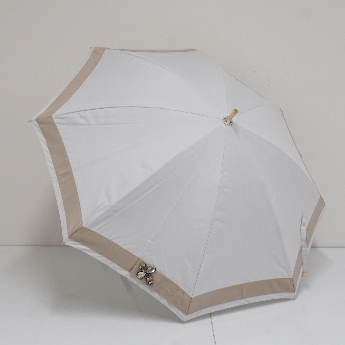 > 晴雨兼用日傘 JILL STUART ジルスチュアート USED品 ビジュー ハチ ロゴ刺繍 ライトグレー UV グラス骨 47cm A3008