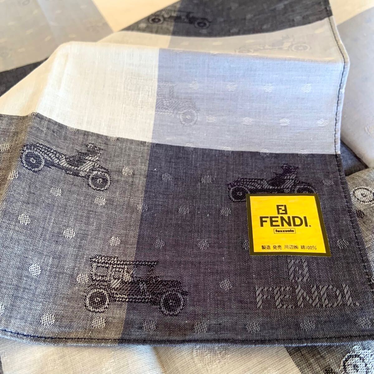 - 未使用 FENDI フェンディ 大判ハンカチ 約45.5×45.5cm 総柄 車柄 ロゴ 綿100% メンズ 紳士 ハンカチ 川辺(株) 希少