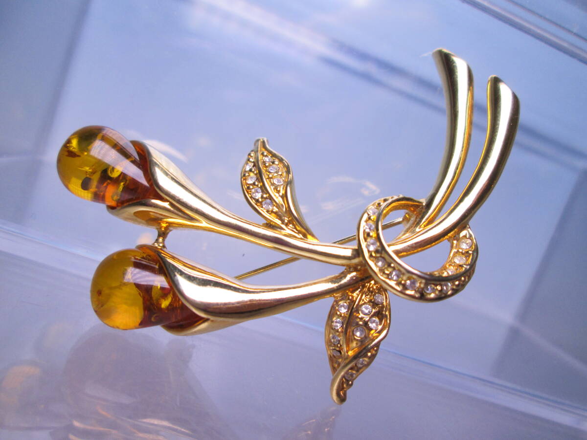 - ☆ブランド不明 天然琥珀&ラインストーン 花のデザインブローチ 16,07g