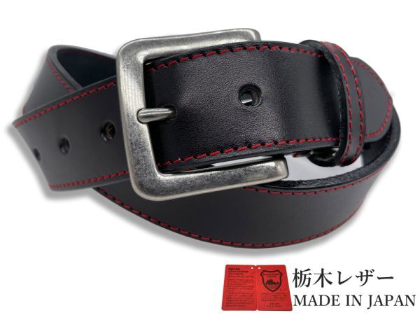 - 新品 栃木レザーベルト カジュアル 牛革 本革 一枚革 国産 メンズ レディース 35mm ステッチ 黒色 ブラック w060-M-BLACK-RED