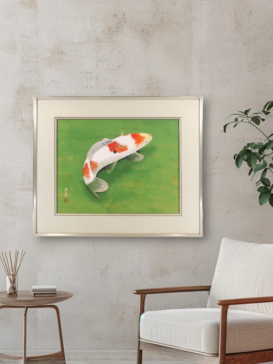> 真作 鈴本月華 日本画「錦鯉」画寸 53cm×41cm 10号 無所属 湯川松堂に師事 鮮やかな緑の水中を悠然と泳ぐ 繊細な筆致で丁寧に表現 11218
