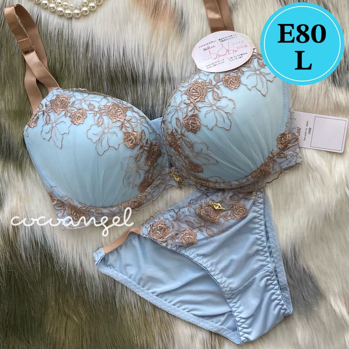 > 【E80/L ブルー 上下セット】新品 ブラ&ショーツ ブラジャーショーツ 脇高 盛りブラ パッド内蔵 バラ刺しゅう セクシーパンティ Eカップ