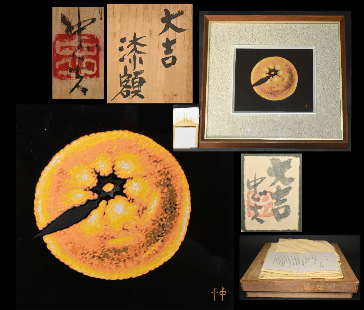 > 真贋保証■大西忠夫 作■ 彫漆 漆額『大吉』共シール 共箱・布・栞付 額装 漆芸家 堆朱楊成に師事 漆芸画 飾額 讃岐漆器 香川伝統工芸