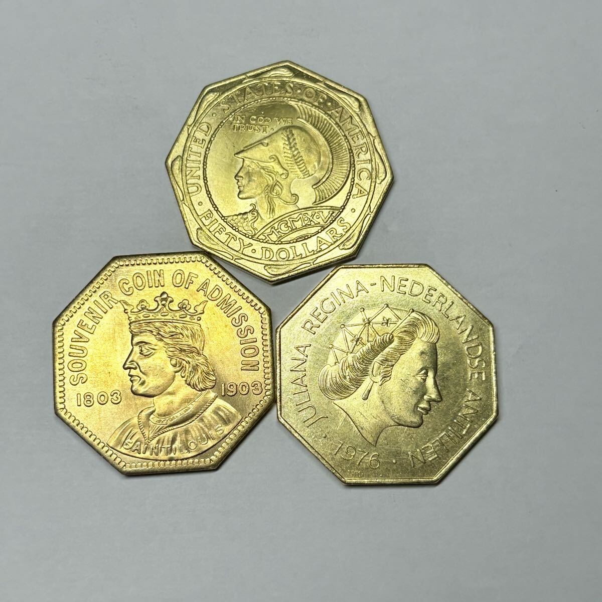 - 【海外記念メダル3枚セット】八角形デザイン アメリカ帆船・博覧会・フクロウ・王室肖像 コレクション向け 異形金貨 海外コイン 外国硬貨