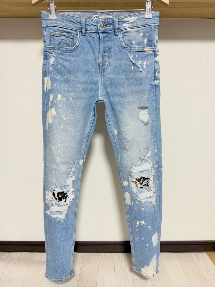 > 春夏カラー ZARA MAN ヒョウ柄 ヘビ柄 ブリーチ デニム 送料230円 38 30 ダメージ スキニー メンズ リペア ストレッチ パンツ ジーンズ