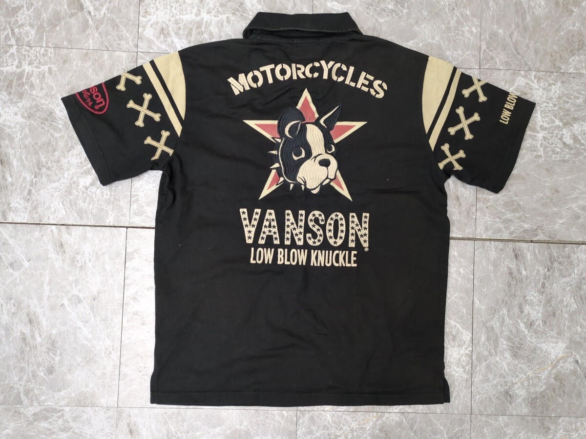 > 15.VANSON デカロゴ 犬 ドッグ アニマル クロスボーン 襟ロゴ 半袖 コットン ポロシャツ バンソン メンズL 黒ベージュx203
