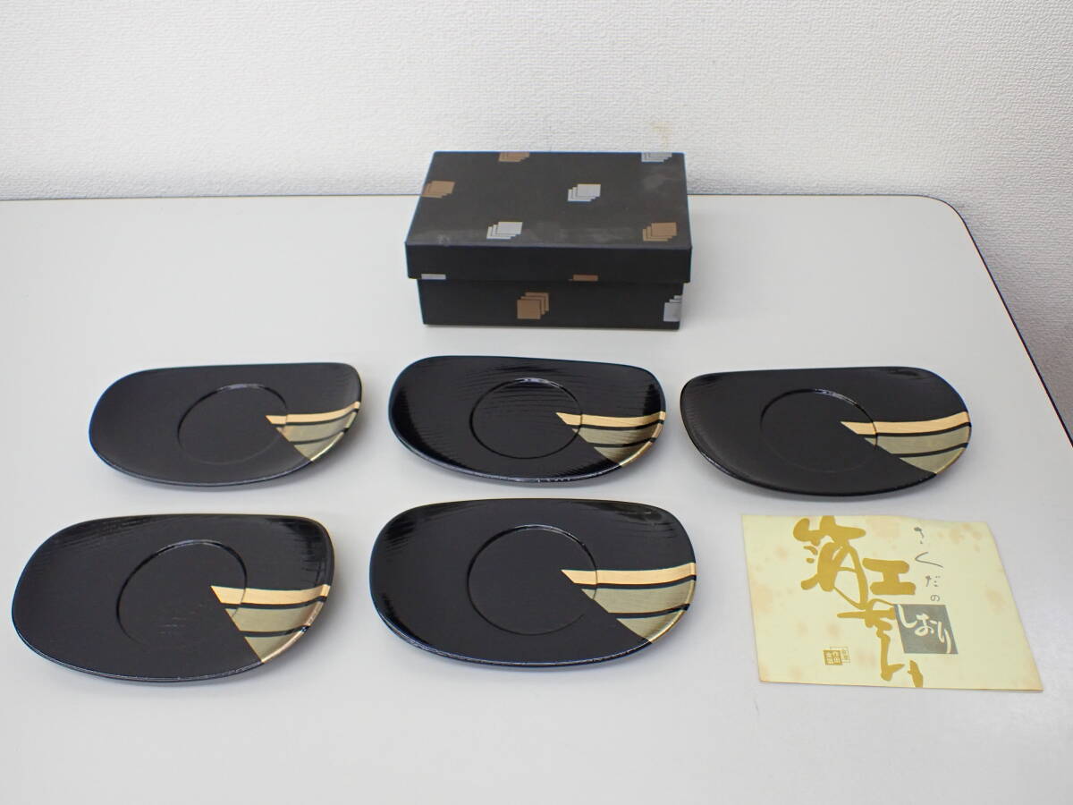 - 木製-50; 金沢 作田金箔 「吟小判 茶托」 5枚揃 約14.9×9.4×高さ;2.2cm 紙箱・栞付き ★