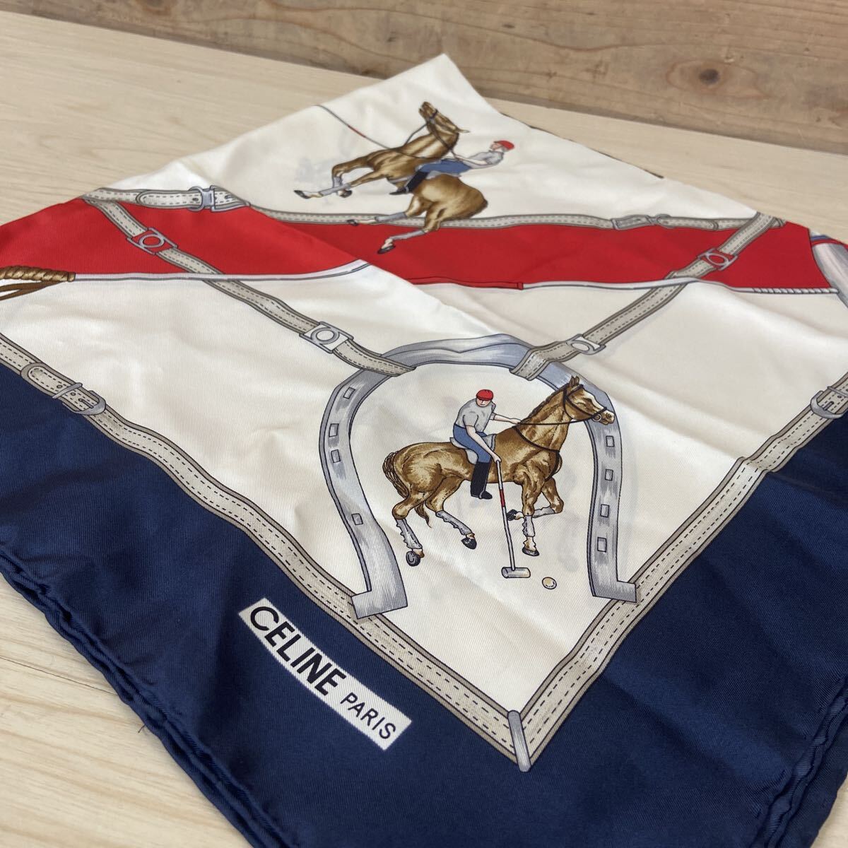 - 16 EN CELINE セリーヌ スカーフ 馬 乗馬 馬具 ふちブルー 大判 87.5×87.5cm シルク