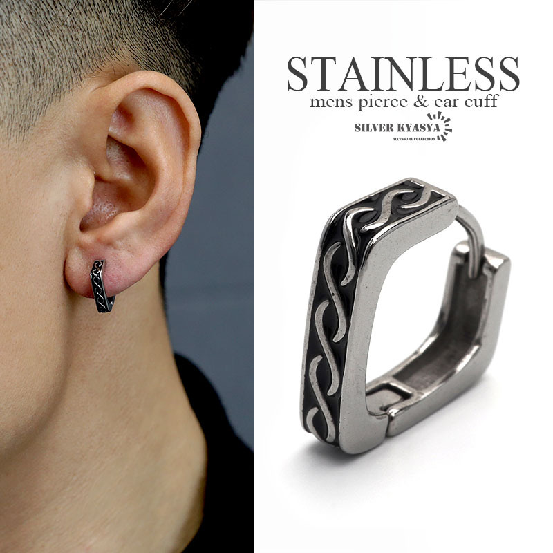 - ひし形 フープピアス ステンレス メンズ シンプル ピアス シルバー 紋章 燻し風加工 金属アレルギー対応 片耳 1点