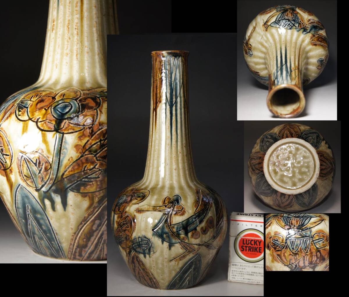 > ヨーロッパ イギリス? アンティーク 彩釉 鎬 花鳥図 花瓶 フラワーベース 民藝 鶴首 花器 花入 飾壷 検:イギリス古窯 ロイヤルドルトン