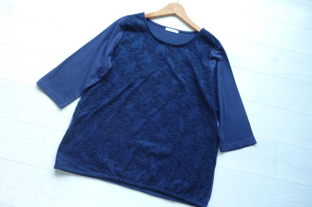> セルフサービス SELF+SERVICE カットソー レース 刺繍 ネイビー 半端袖 L 綿混 コットン混 トップス レディース