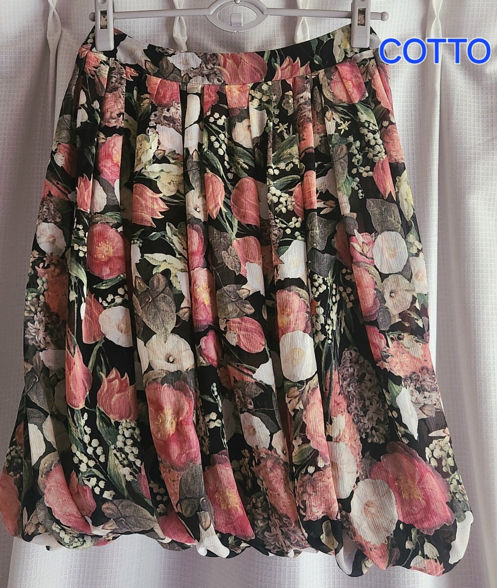 - 短使用レベル COTTO 日本製 シルクシフォンのバルーンスカート 花柄 黒 ひざ丈