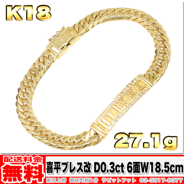 > 【送料無料】18金 喜平 ブレスレット 改 天然ダイヤ 0.3ct 6面 ダブル 27.1g 18.5cm ◆ K18 30g くらいお探しの方いかがでしょうか (中古)