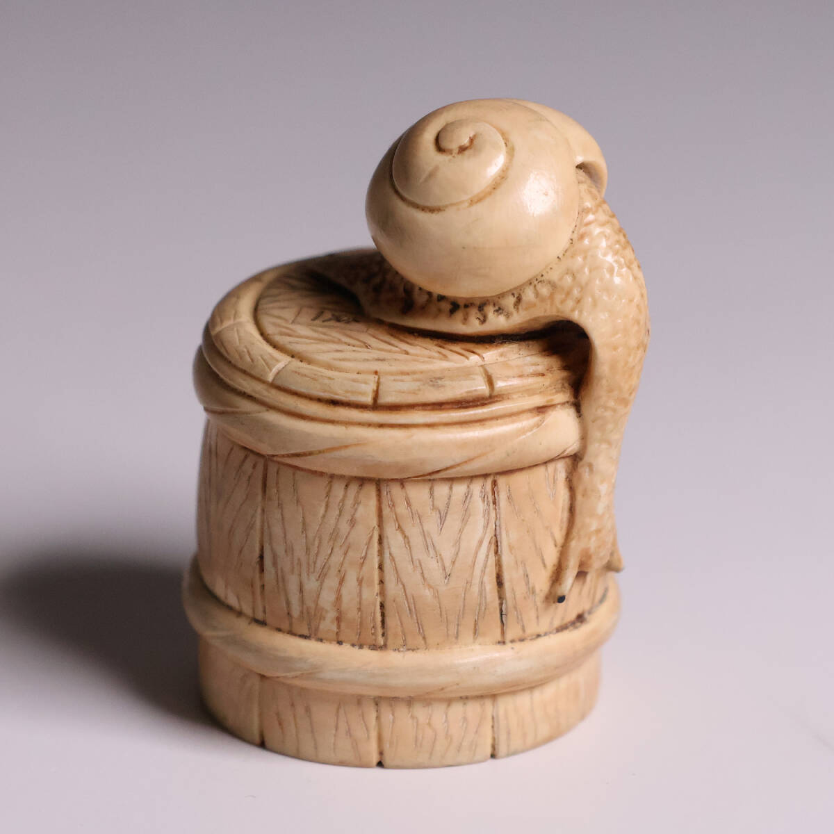 - 時代 堤物 根付 天然素材 牙彫 桶に蝸牛 在銘 友一 かたつむり 彫刻 提げ物【CM263】