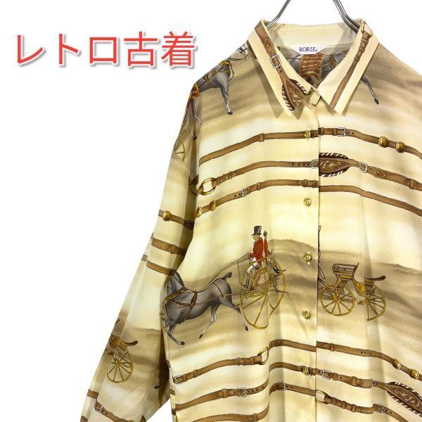 - レトロ古着 長袖シャツ 総柄 馬車 ベルト アート サイズ82 ポリシャツ 金ボタン レディース