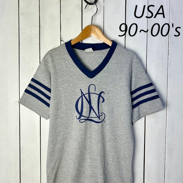 - T●209 USA古着 90s~00s 袖ライン入り 切り替え VネックTシャツ S ライトグレー AUGUSTA オールド アメリカ古着 ヴィンテージ