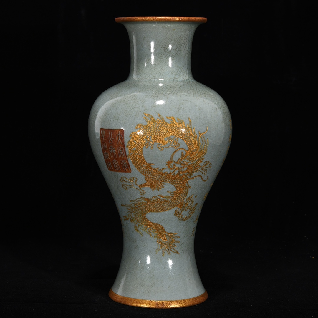 - 8+GV5934「東洋美術」 中国骨董 人間国宝 磁器製品【口に銘文と龍の模様が刻まれた金箔観音花瓶】 旧物 孤品 珍品 陶磁器 収蔵価値が高い