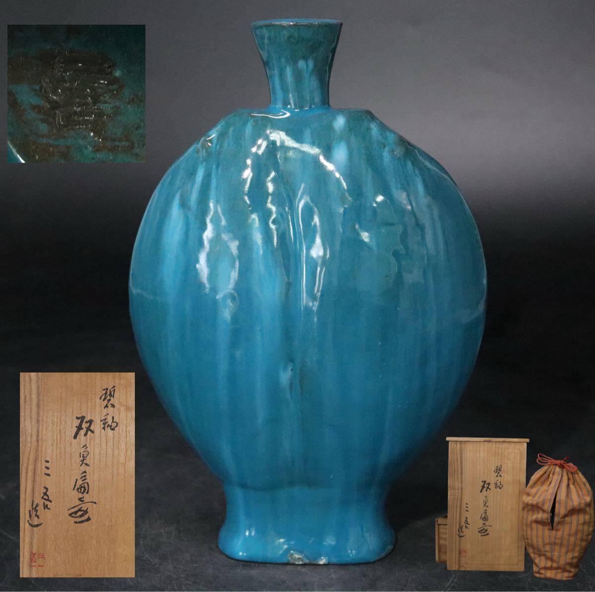 > 宇野三吾 造 「 碧釉 双魚扁壺 」 共箱 ・ 仕覆付 / 京都 現代陶芸 花器 花瓶 煎茶道具 .B904