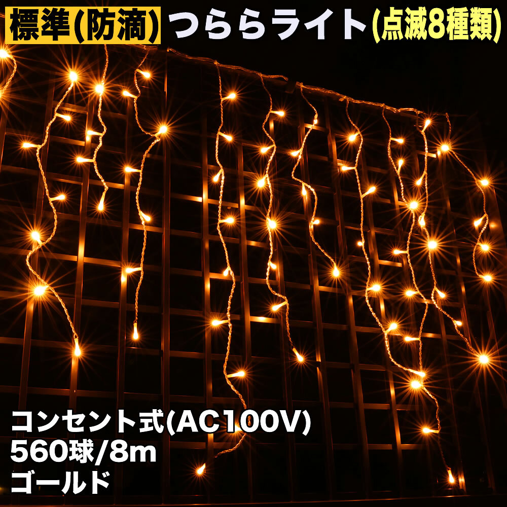 - クリスマス 防滴 イルミネーション つらら ライト LED 8m 560球 ゴールド 8種類点滅 Aコントローラセット
