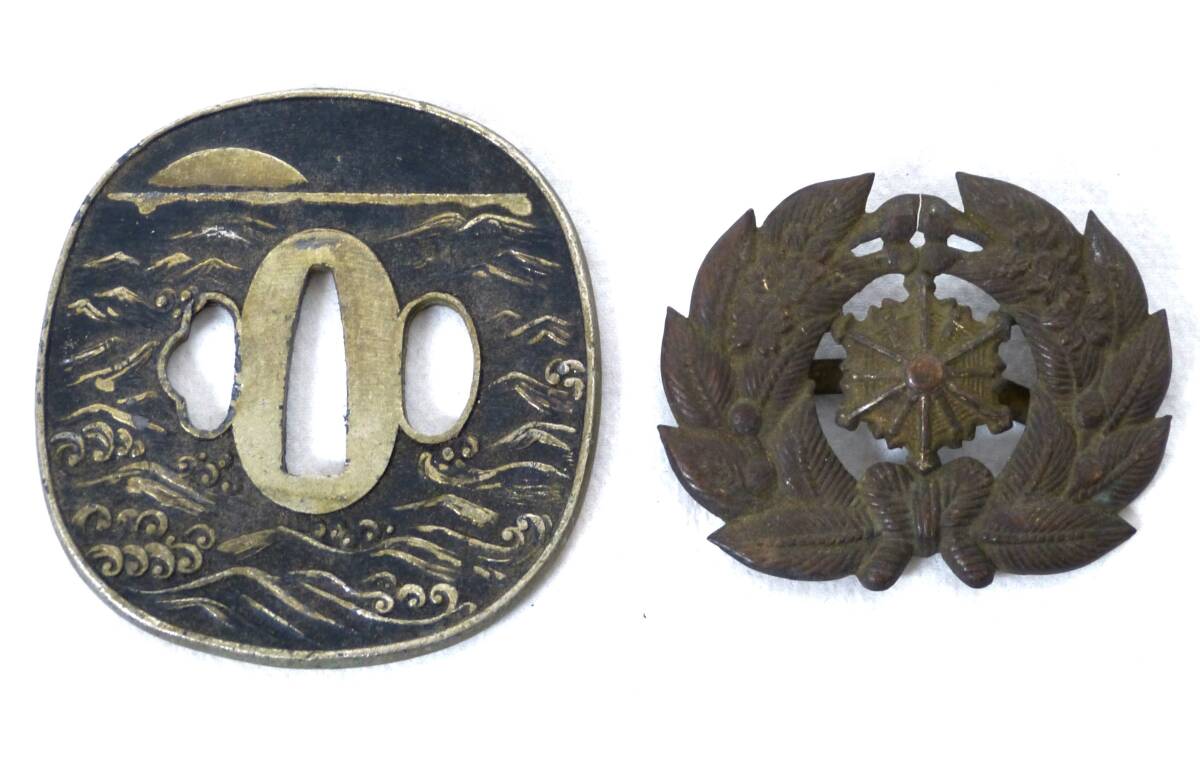 - 鍔 つば 旭日章(飾り付) § 日の出の波 鶴 § 古鍔 鉄地 武具 刀剣 刀装具 骨董美術品 共箱 ※年代詳細不明