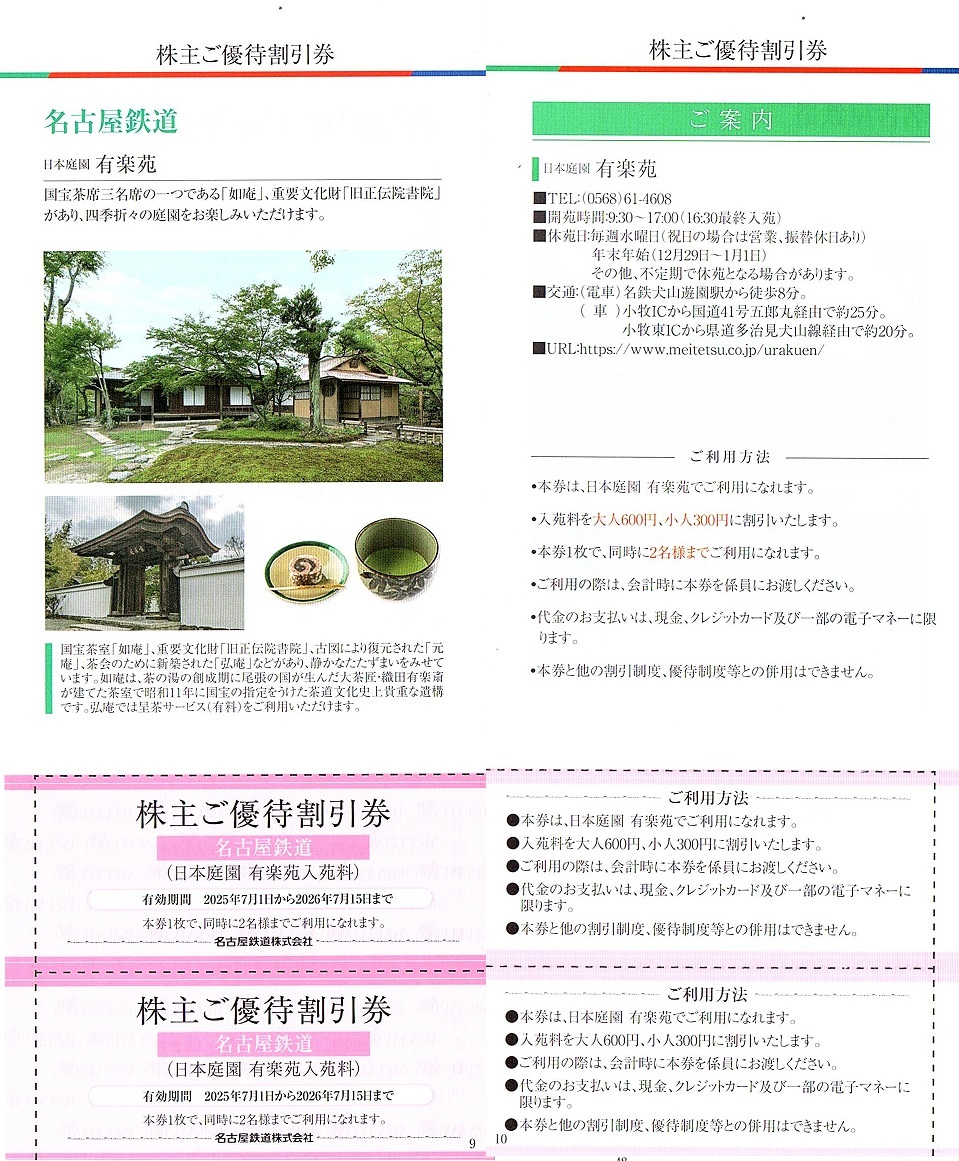 - 名古屋鉄道(名鉄)株主優待券 日本庭園 有楽苑 割引券 4枚set ~2組迄 2026年7月15日迄有効