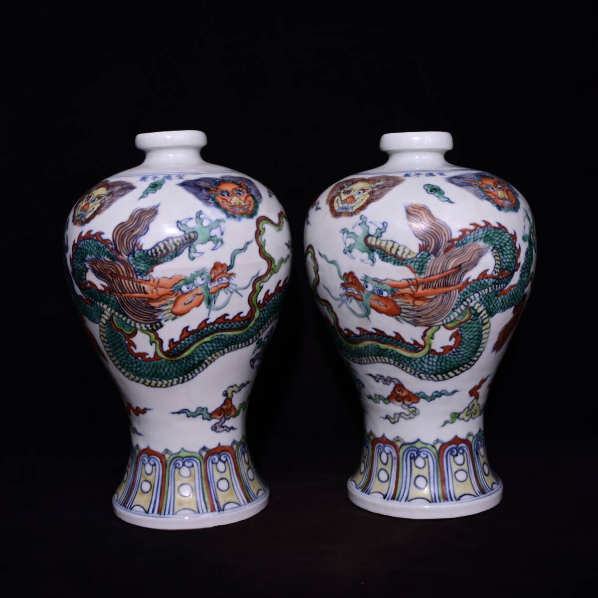 - 8+GV5949「東洋美術」 中国骨董 人間国宝 磁器製品【色鮮やかな龍模様の腰梅花瓶】 旧物 孤品 珍品 陶磁器 収蔵価値が高い