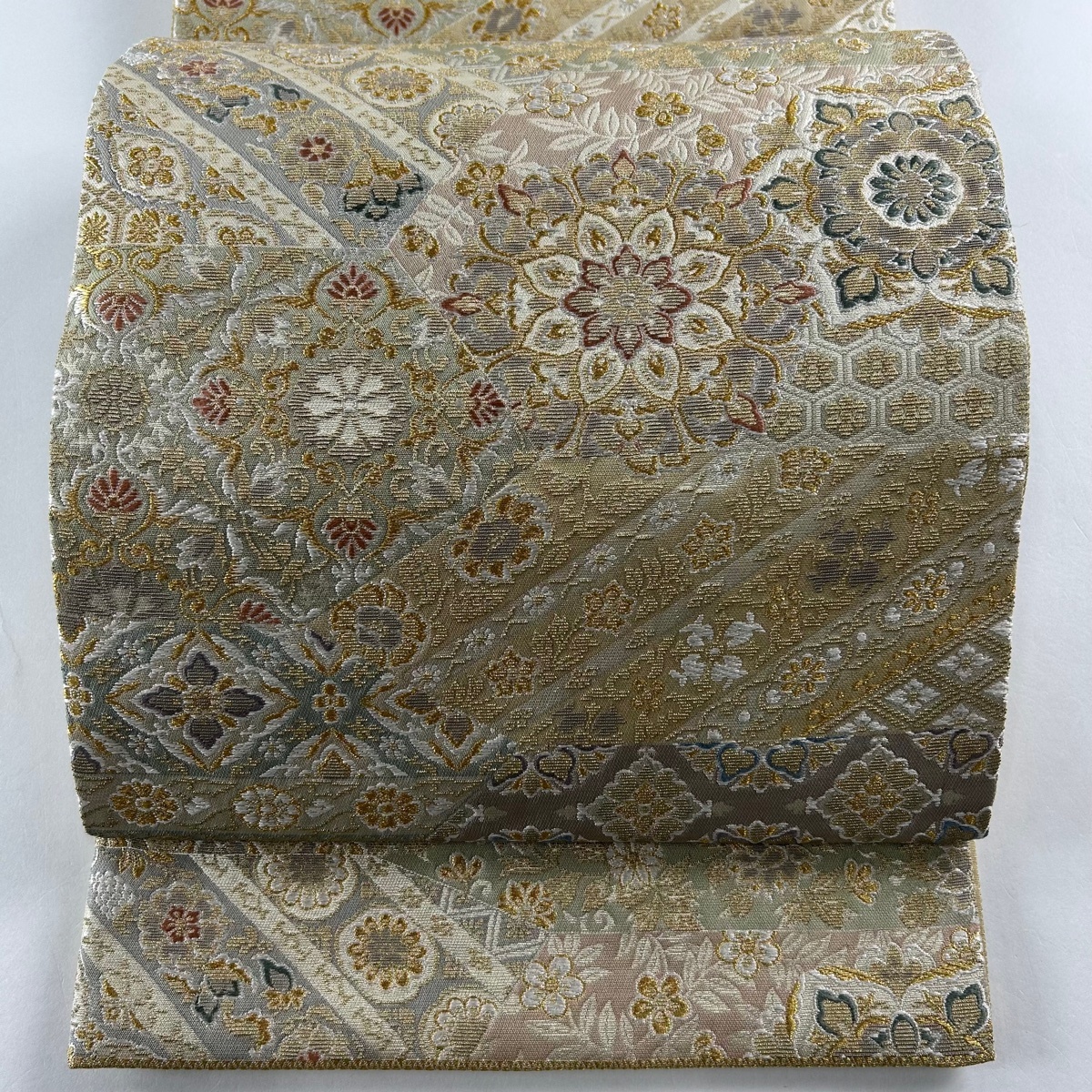 - 袋帯 美品 名品 横段裂取華文 金銀糸 箔 ベージュ 六通 正絹 【中古】