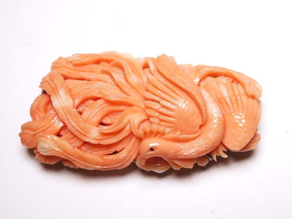 - 【11324】和装小物 (明治・大正・昭和) 鳳凰彫 珊瑚 帯留(初品・買取品)