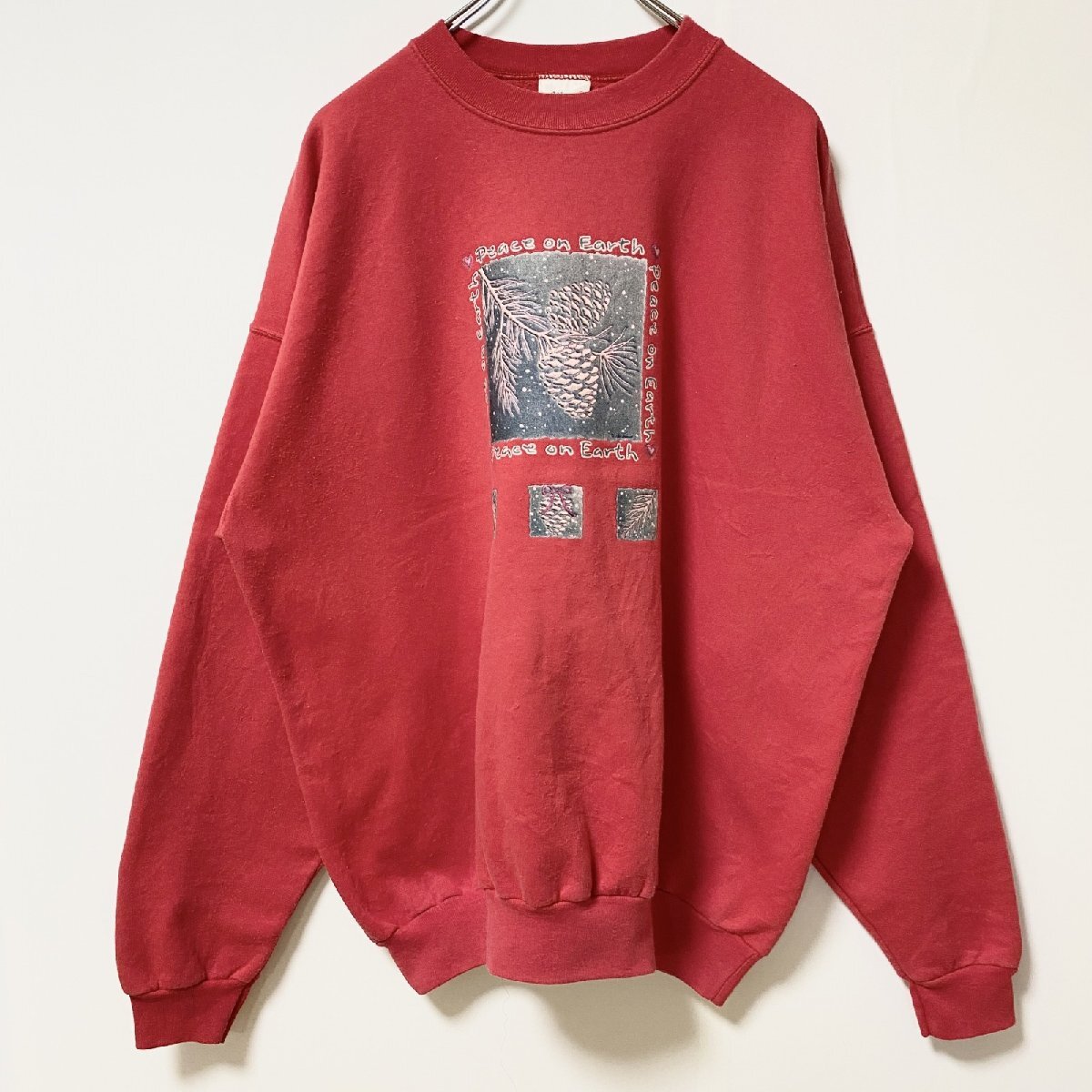 - 古着 used Hanes ヘインズ 長袖プリントスウェット トレーナー 松ぼっくり 赤 レッド ビッグシルエット XLサイズ