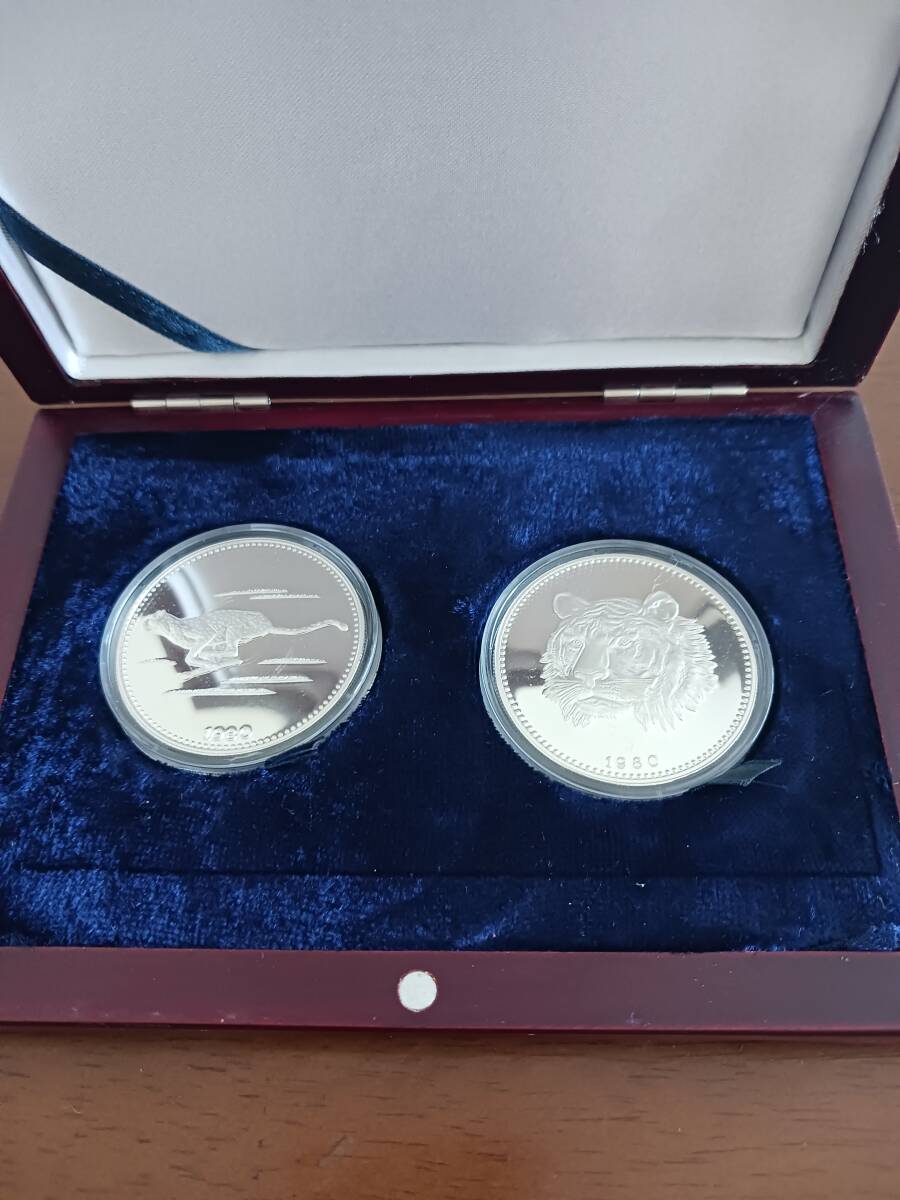 - ★赤道ギニア共和国★2000EKUELE PROOF銀貨★Tiger&Cheetah★2PCS SET★1980年★オリジナル木製ケース★