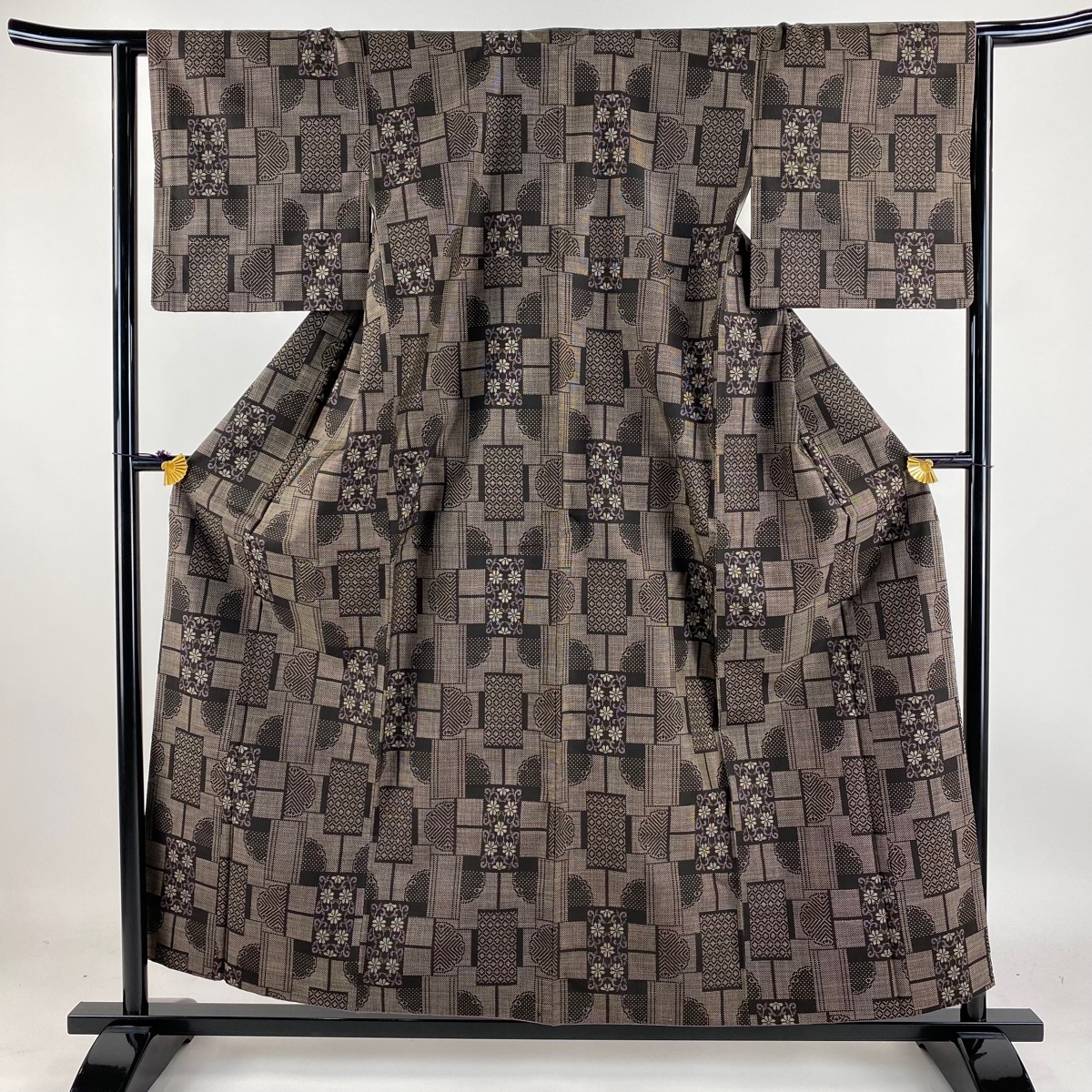 - 紬 身丈157.5cm 裄丈63cm S 袷 花唐草 幾何学模様 焦茶色 正絹 美品 秀品 【中古】