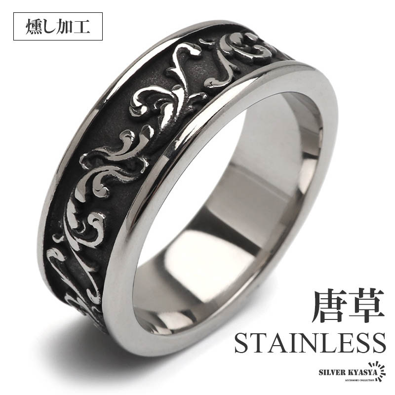 - (16号) ステンレス 唐草リング メンズリング アンティークリング シルバー アラベスク 燻し ブラック 男性 金アレ対応