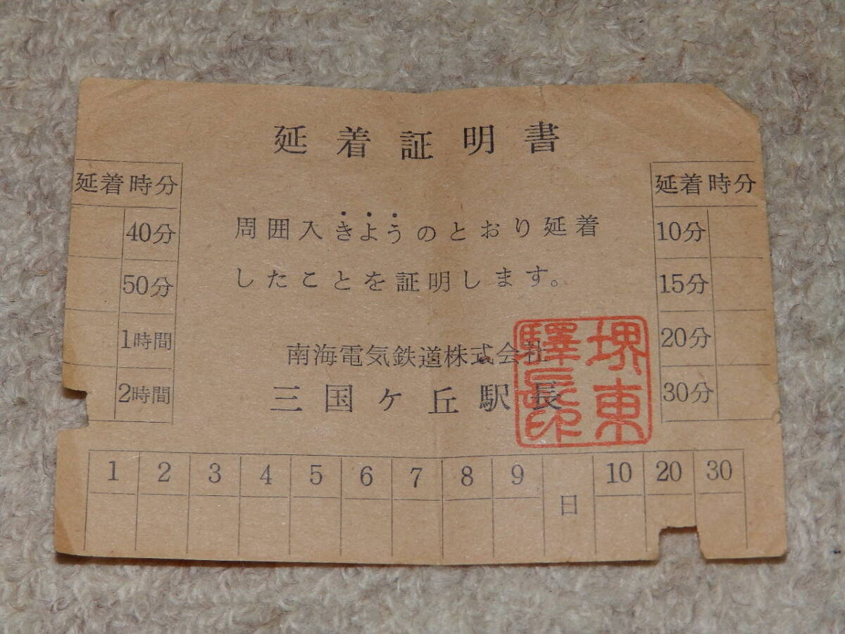 - 南海電車 延着証明書 三国ヶ丘駅長 ヤケ・折れ・シワあり