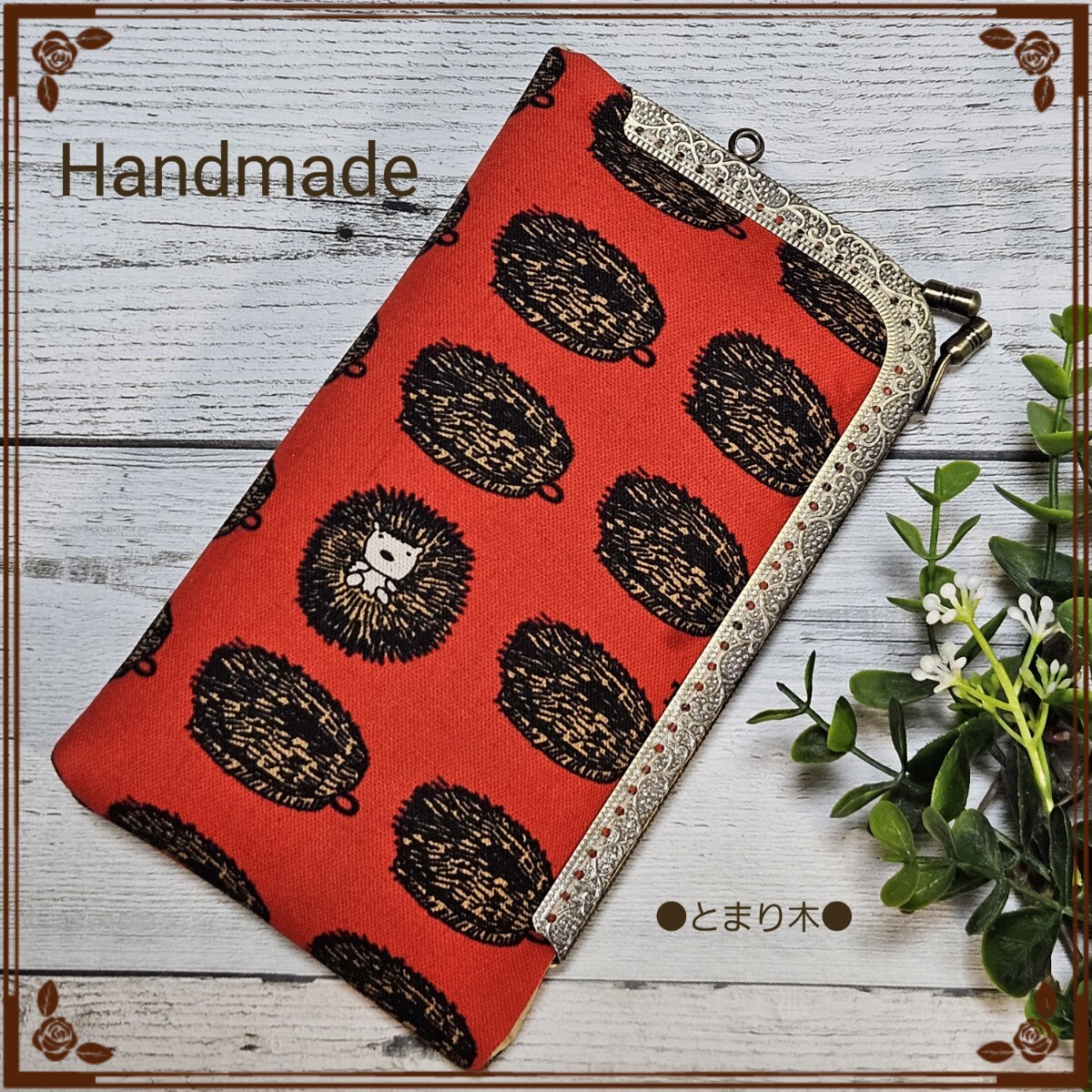 > 【送料無料】◆ハリネズミとたわし(レッド)◆L字がま口【スマホポーチ】【通帳ケース】etc…◆ハンドメイド◆内ポケット付き◆