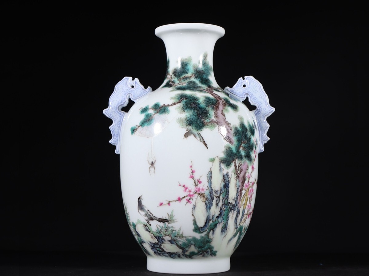 - 「清 乾隆年製 陶磁器 琺瑯彩花鳥詩文 双耳瓶」染付 置物 擺件 古賞物 中国古美術 旧蔵出