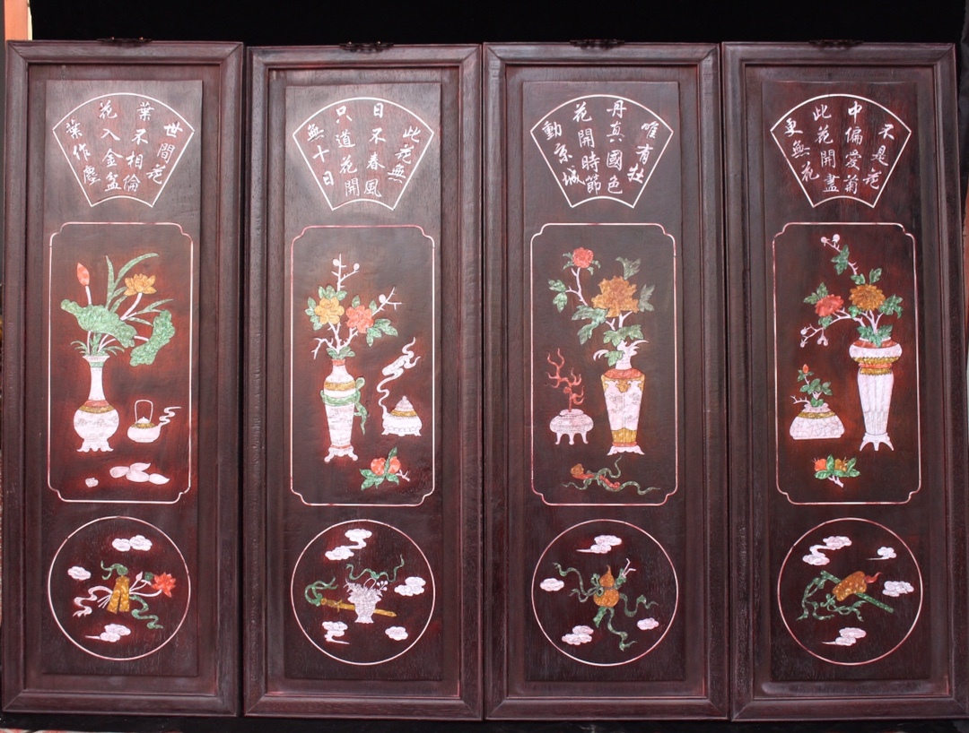 - 多宝閣■207272 木工芸品 彫刻品 【螺鈿細工を施した四面屏風】 中国骨董 時代物 本物 珍品旧蔵 伝世家珍 孤品