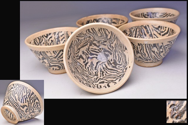> 花明山窯 ★ 練込 煎茶碗 5客 ★ 汲出茶碗 ★ 煎茶道具 ★ 亀岡窯 ★ 丹波焼 ★ 見事な練上 ★ マーブル模様 ★ 1点 見込みに石はぜ有り ★